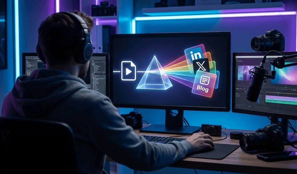 Arrêtez de laisser vos vidéos "mourir" après 48h. Découvrez le workflow secret pour inonder LinkedIn, Twitter et votre Blog à partir d'un seul fichier, sans rien rédiger vous-même.
